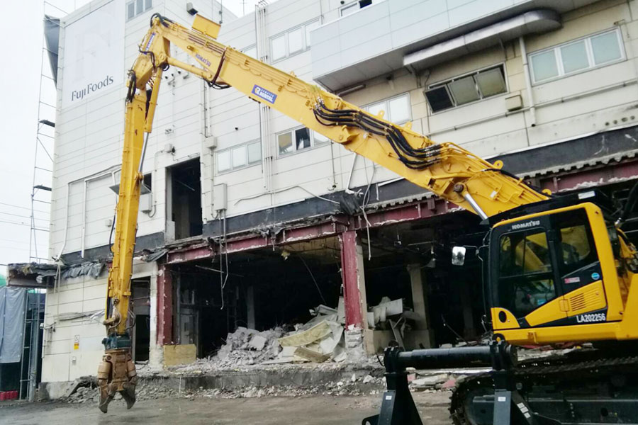 通常の解体工事では、油圧ショベルなどの重機を使って効率的に建物を壊していきます。