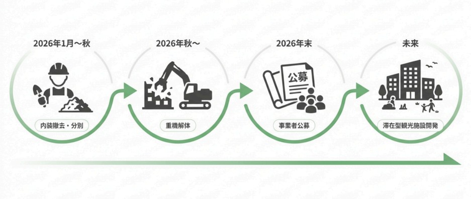 更地化された後の広大な跡地(約8,000m2超)については、更地化が完了する2026年末頃をめどに、新たな事業者の公募が開始される予定です。