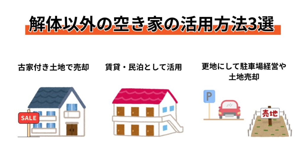 そんな想いをお持ちの方もいらっしゃるでしょう。後悔のない決断を下すためにも、解体以外の主な活用法についてご紹介します。