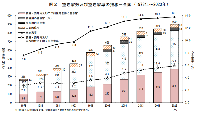 画像引用:空き家数及び空き家率の推移-全国(1978年~2023年)