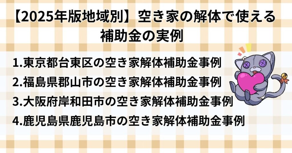 ここでは、地域別に空き家の解体で使える補助金制度の実例をご紹介いたします。