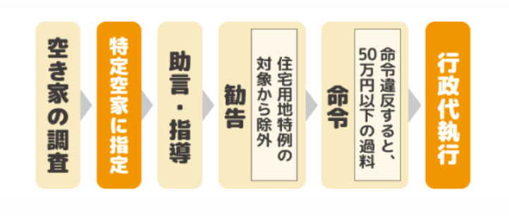自治体が管理不全空家、特定空家に指定した場合は、空き家の所有者に「空き家の適切に管理するように」という通知が届きます。その通知が来ても空き家に改善が見られない場合は、以下の段階で措置が進んでいきます。